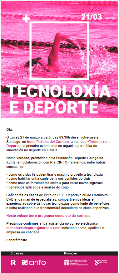 Pregamos confirmes a túa asistencia no correo electrónico tecnoloxiadeporte@mundo-r.net indicando nome, apelidos e empresa ou entidade.