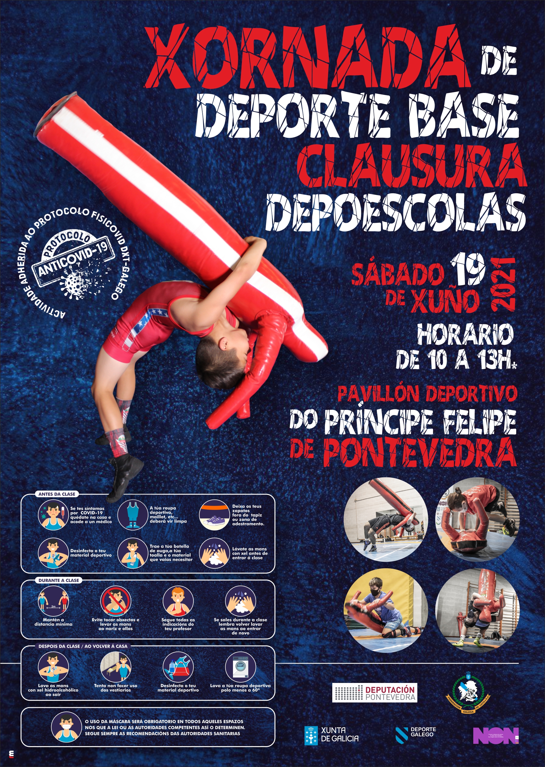 O sábado 19 de Xuño, terá lugar a clausura das DEPOESCOLAS da DEPUTACIÓN DE PONTEVEDRA, no pavillón PRÍNCIPE FELIPE de Pontevedra, cunha xornada de deporte adaptado: o Wrestling Dummy, desenrolada de 10:00 a 13:30 horas.